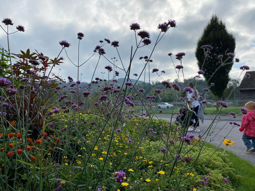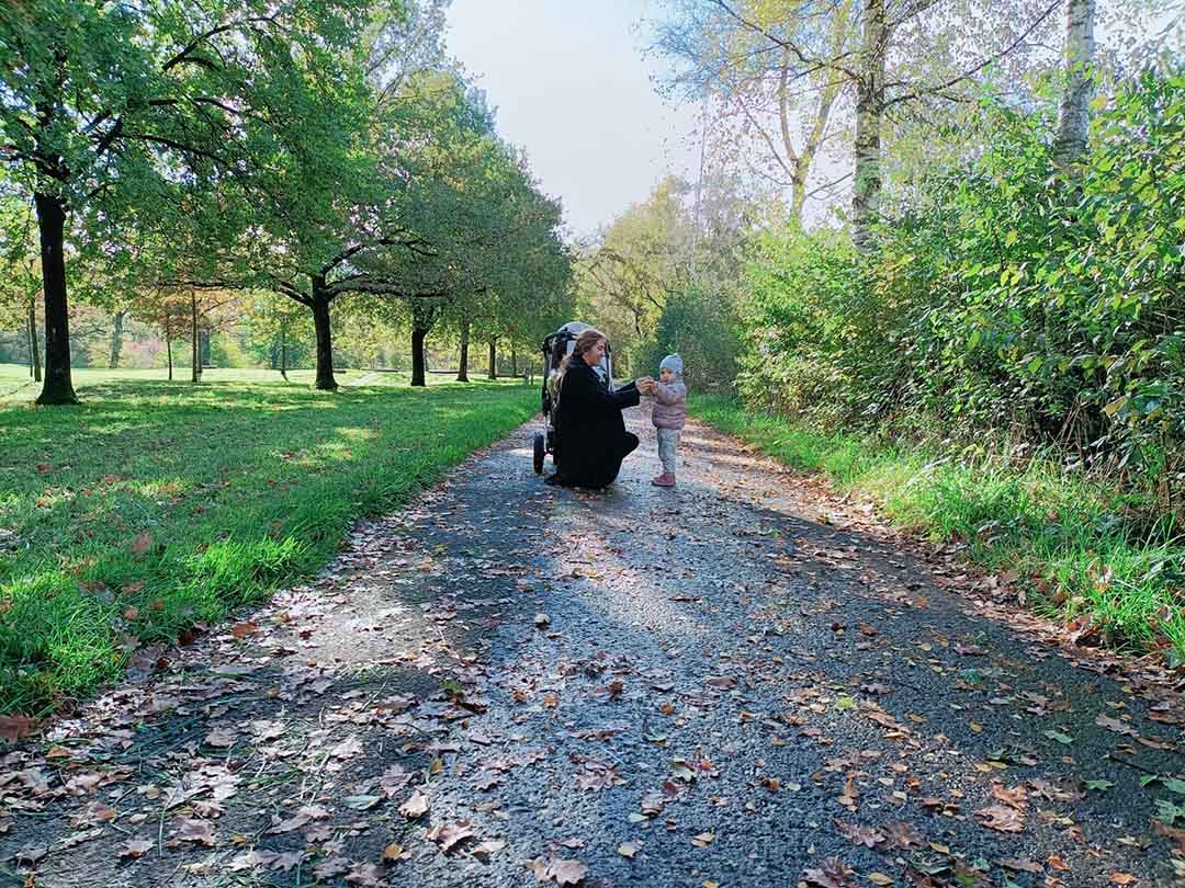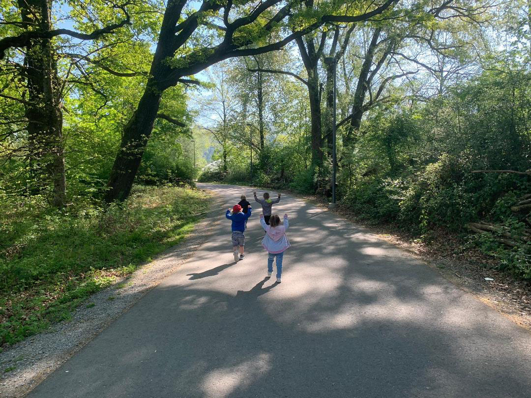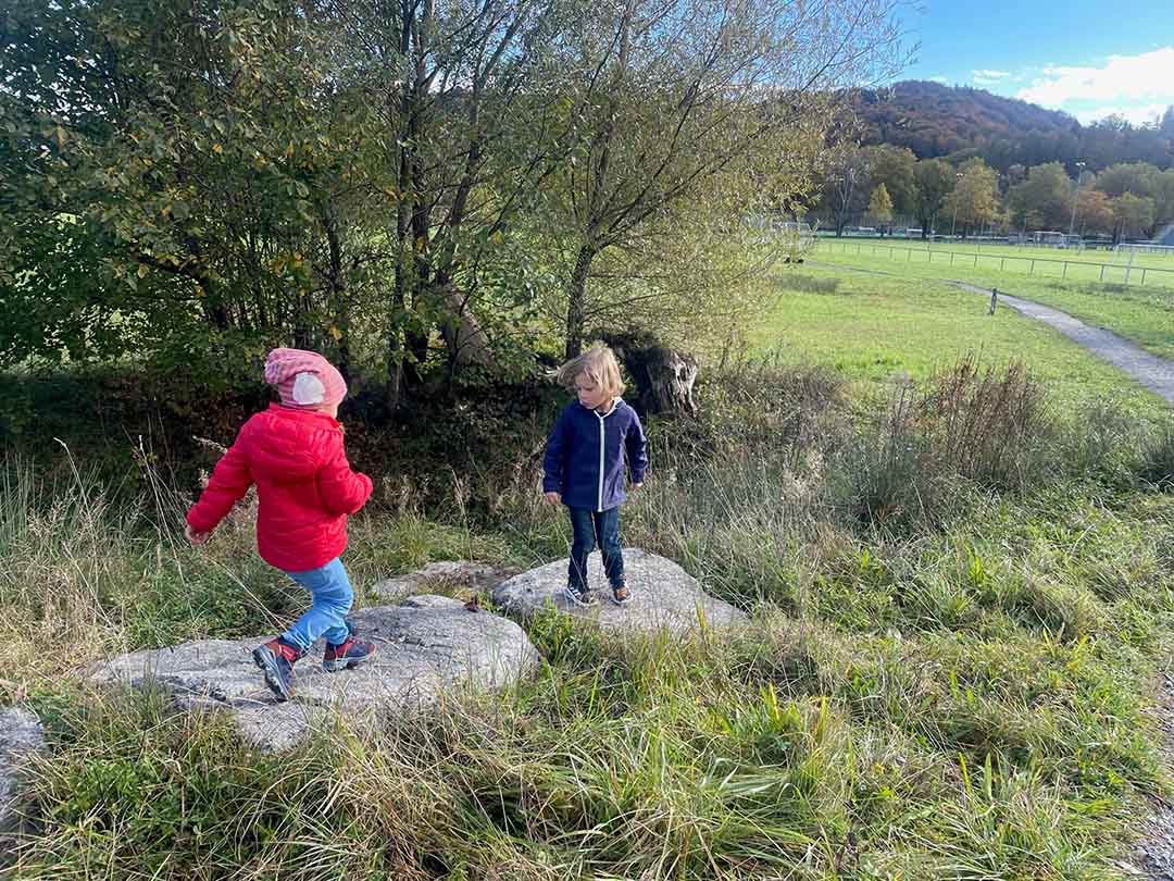 Warm eingepackt spazieren wir momentan häufig auf der Allmend. Hier können wir klettern, rennen und die Natur bewundern. Die Bäume und ihre verschiedenen Farben beeindrucken die Kinder.